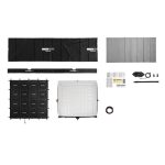 The Aputure INFINIMAT LED & Clear Softbox Pack 8×8 includes one INFINIMAT RGBWW LED 8×8 lamp head and one matching clear inflatable softbox pack complete with diffusion cloths and a light control grid. The clear inflatable softbox provides structural rigidity for the lamp head and can be used clear for maximum output or with the included diffusion cloth for a softer source.