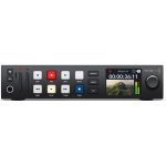 About The Blackmagic Hyperdeck Studio HD PlusHyperDeck Studio HD Plus HyperDeck Studio HD Plus includes all the features of the Mini model, but is larger so it has more space for extra controls and extra connections. This model adds 6G-SDI so it can record and playback ProRes up to Ultra HD 30fps, and it includes an SDI loop out and HDR support. Plus the two 6G-SDI outputs allow fill and key playback up to 1080p60. There is also an HDMI input and a dedicated 3G-SDI monitoring output with overlays. Any button pushed on the front panel is sent to a dedicated RS-422 remote output and the DC power is now a broadcast style XLR connector. The front panel is also upgraded with better transport control buttons, a headphone socket and built in speaker. Front Speaker Press the button to monitor audio via speaker. Media Status Animated indicators show record or playback. Transport Broadcast style deck control buttons. LCD Display Shows video, transport, audio meters and menu. Headphones 1/4″ audio jack to connect headphones. SD Card Slots Supports SD cards and the faster UHS-II cards. Menu Buttons Change settings by scrolling menus with the search dial. Search Dial Compact search dial for shuttle, jog and scroll. AC Power Inputs Built in 100-240V AC power supply. Remote In/Out RS-422 deck control, loops to multiple decks. USB-C Record to external disks or disk arrays. Reference In/Out Built in sync generator for syncing decks. 6G-SDI Video Supports SD and HD to 1080p60 and ProRes to 2160p30. DC Power Input Broadcast style 4 pin 12V power connection. 1G Ethernet Allows remote deck control and file transfer. Timecode In/Out Timecode connections from internal generator. HDMI In and Out Record and play to cameras, projectors and TVs.