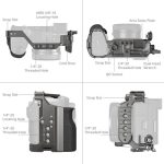 The kit includes a cage and cable clamp with SmallRigs patented HawkLock quick release system for secure and smooth mounting. The cage features a three-point locking system, silicone padding for protection, and a hinged door at the battery compartment for extra support. Various mounting interfaces are available for attaching additional accessories, and an integrated Arca-Swiss quick release plate allows for quick switching between shooting modes.