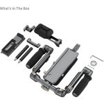 The handle, attached using an ARRI rosette, can be detached to mount other accessories. Versatile expansion options also include built-in 1/4″-20 locating holes on the extension arms for monitor attachment using a magic arm, and a 15mm rod clamp along with two 15mm rods for mounting follow focus and V-Mount batteries. Multiple 1/4″-20 threaded holes at the rear accommodate counterweights, while cable clamps on both extension arms keep the setup tidy.