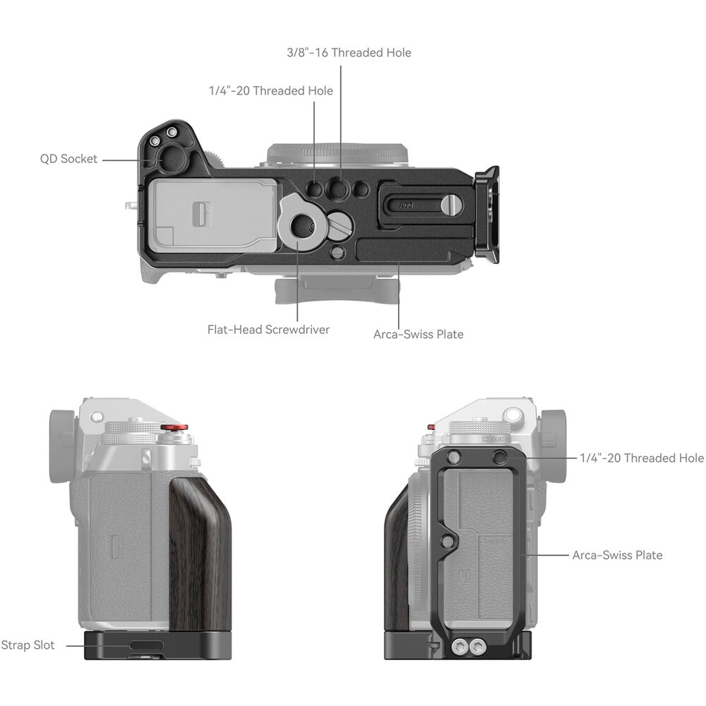 SmallRig L-Bracket for FUJIFILM X-T5 4137 is designed to facilitate the switch between horizontal and vertical modes and to improve grip experience. It locks the camera via one 1/4″-20 screw and one locating pin at the bottom, with rubber pads preventing scratches, and gives full access to buttons, card slots, battery door, and flip screen. Apart from a built-in blackwood grip for an enhanced grip experience, the plate also has various accessory mounts. At its bottom there is an Arca-Swiss quick-release plate for Arca-Swiss tripods and DJI RS 2 / RSC 2 / RS 3 / RS 3 Pro gimbals, 1/4″-20 threaded holes, and 3/8″-16 threaded holes that support Manfrotto-type plate 1280 or Side Handle 2093 for a handheld vertical shot. For further security, a strap slot and a QD port are available for attaching Hand Strap 3848 & 2456 or quick-release QD shoulder buckle. Besides, the side plate features 1/4″-20 threaded holes to mount Cold Shoe Mount BUC2736 for the microphone, etc., and can be stretched to allow cables through. Other highlights include a magnetic slotted screwdriver for easy assembly and disassembly and a complimentary shutter button which helps improve touch.