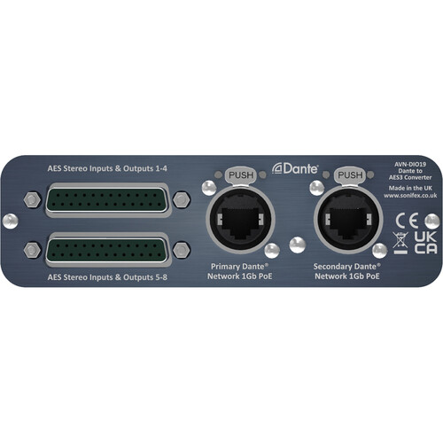 The AVN-DIO19 is a fully Dante compliant device that converts up to eight digital stereo AES3 inputs and eight digital stereo AES3 outputs to and from the Dante Audio-over-IP networking standard. It features dual redundant primary and secondary Dante network ports, powered via PoE with dual redundancy. The device is also AES67 compatible and Dante Domain Manager compliant.