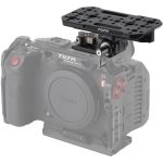 The clamp connects to almost any camera cage via a 1/4″-20 screw with a retractable locating pin to prevent rotation when locating points are available.