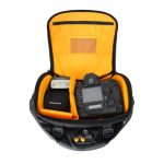One half of the main compartment is designed to fit a Pro DSLR or Mirrorless body attached to a 200-600mm f5.6-6.3 lens. An adjustable thick, sturdy and well-padded cradle supports the camera body from below and secures the large lens in position, while making sure it is well protected all around the delicate connection point.