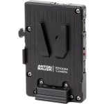 Wooden Camera brand Pro V-Mount plate is a metal power plate, created in partnership with Anton Bauer, with a rugged aluminium body for durability and secure battery mounting. Features 3x D-Taps for accessory power at battery voltage (12-16V), a digital fuse with reset button, rear cover plate, and captive mounting screws. Should the user exceed the set current for accessories, only the accessory outputs are disabled leaving the camera running normally. Once the current load has been reduced by either removing accessories or reconfiguring, the reset button can be pressed to enable accessory power again.